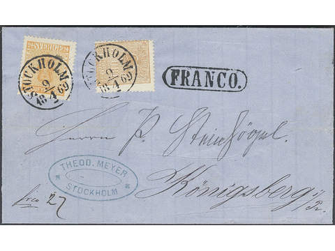Sweden. Facit 10h2, 14Bd cover , 24 öre reddish orange, perforation of 1865, 3 öre orange-brown on beautiful cover of lowest rate to Germany (Prussia). Cancelled STOCKHOLM 9.4.1869 and boxed FRANCO on front. Exhibition item!