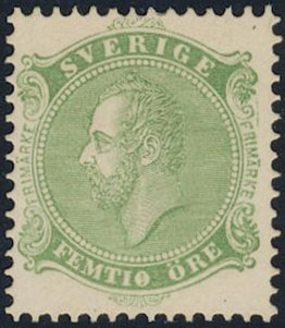 Sweden, C A Nymans proposal stamp FEMTO öre in yellow green colour with dashed background. With variety partly filled 'O'.
