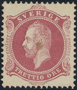 Sweden, C A Nymans proposal stamp TRETTIO öre in carmine red colour with smooth background. Spot.