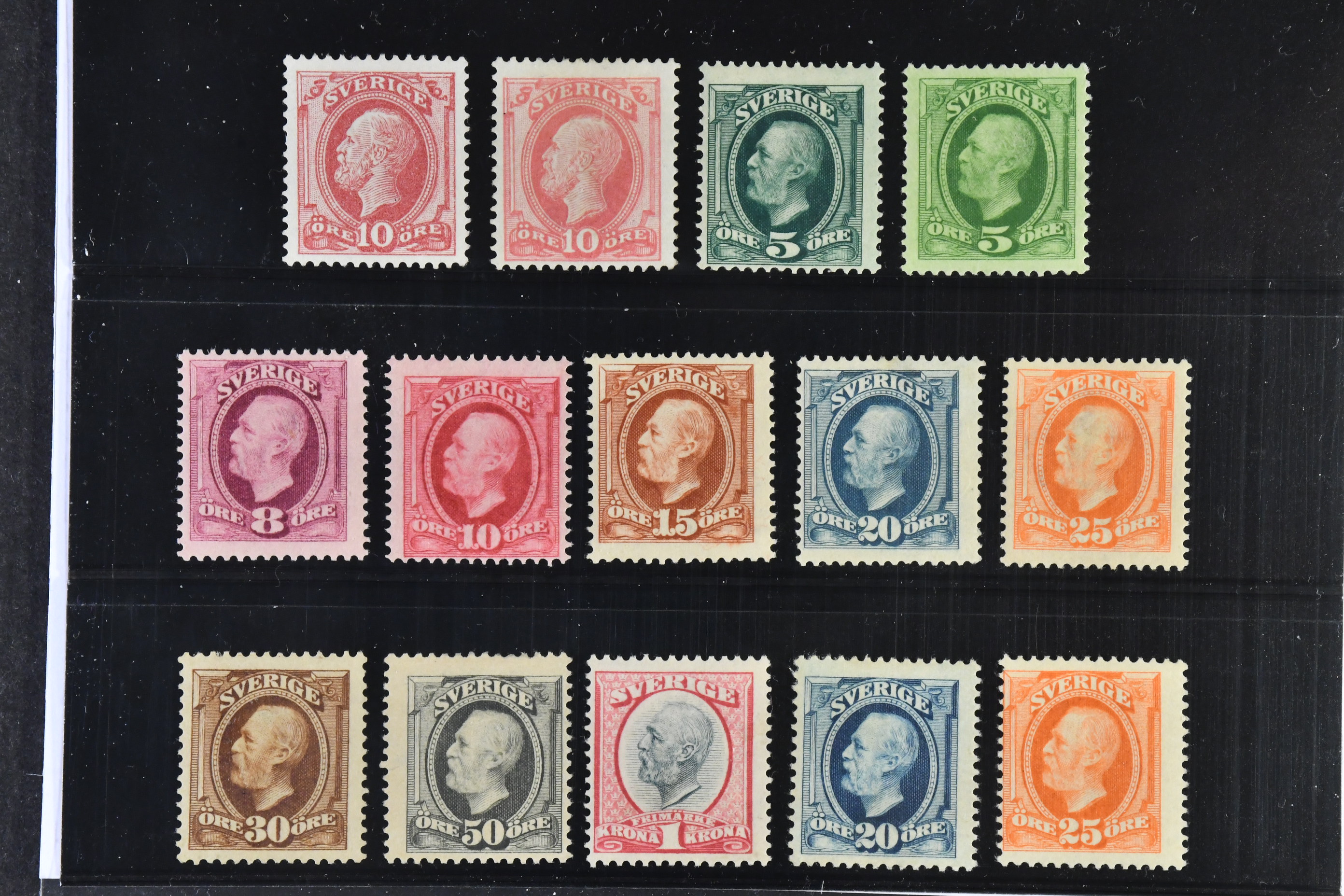 Sweden. Facit 39, 45, 52–60, 66–67 ★, Oscar II cpl SET (13) incl. letter press (F39 without gum), plus an extra 5 öre in different shade. Mostly good quality. SEK 6410