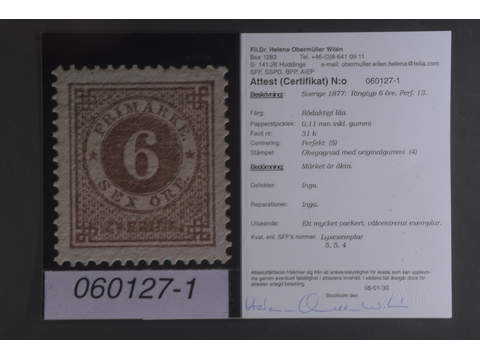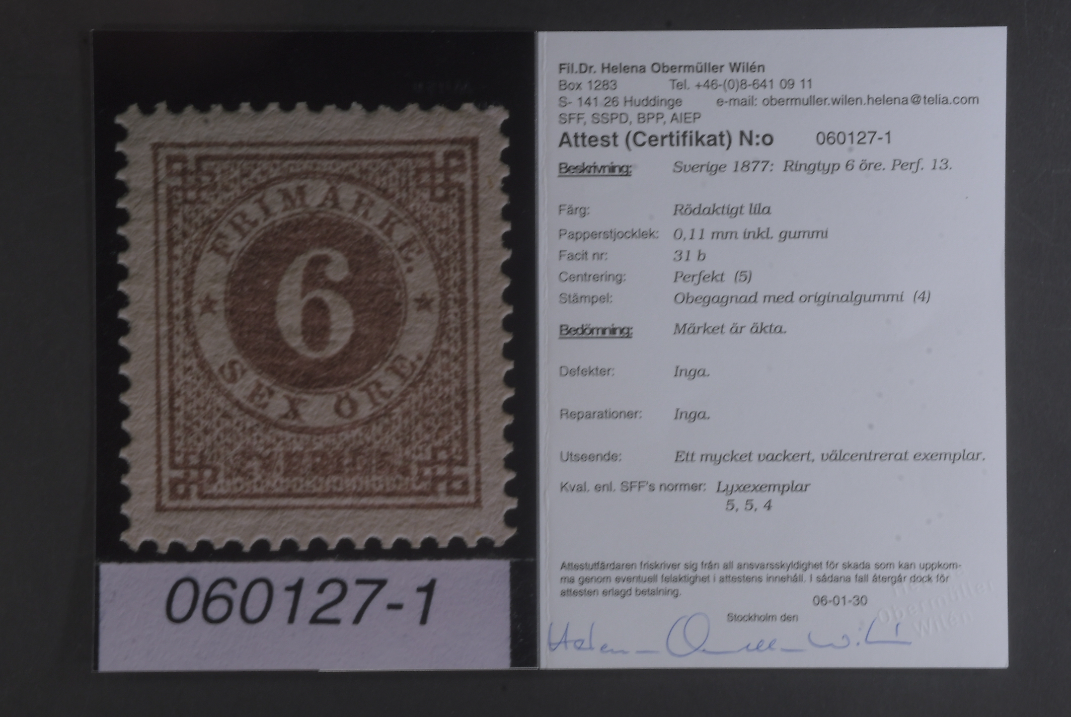 Sweden. Facit 31b ★★, 6 öre reddish lilac. EXCELLENT example. Certificate HOW 5, 5, 4 …