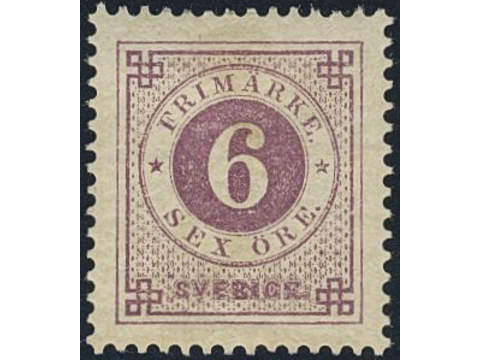 Sweden. Facit 31k ★, 6 öre red-lilac on calendered paper. Superb centering.