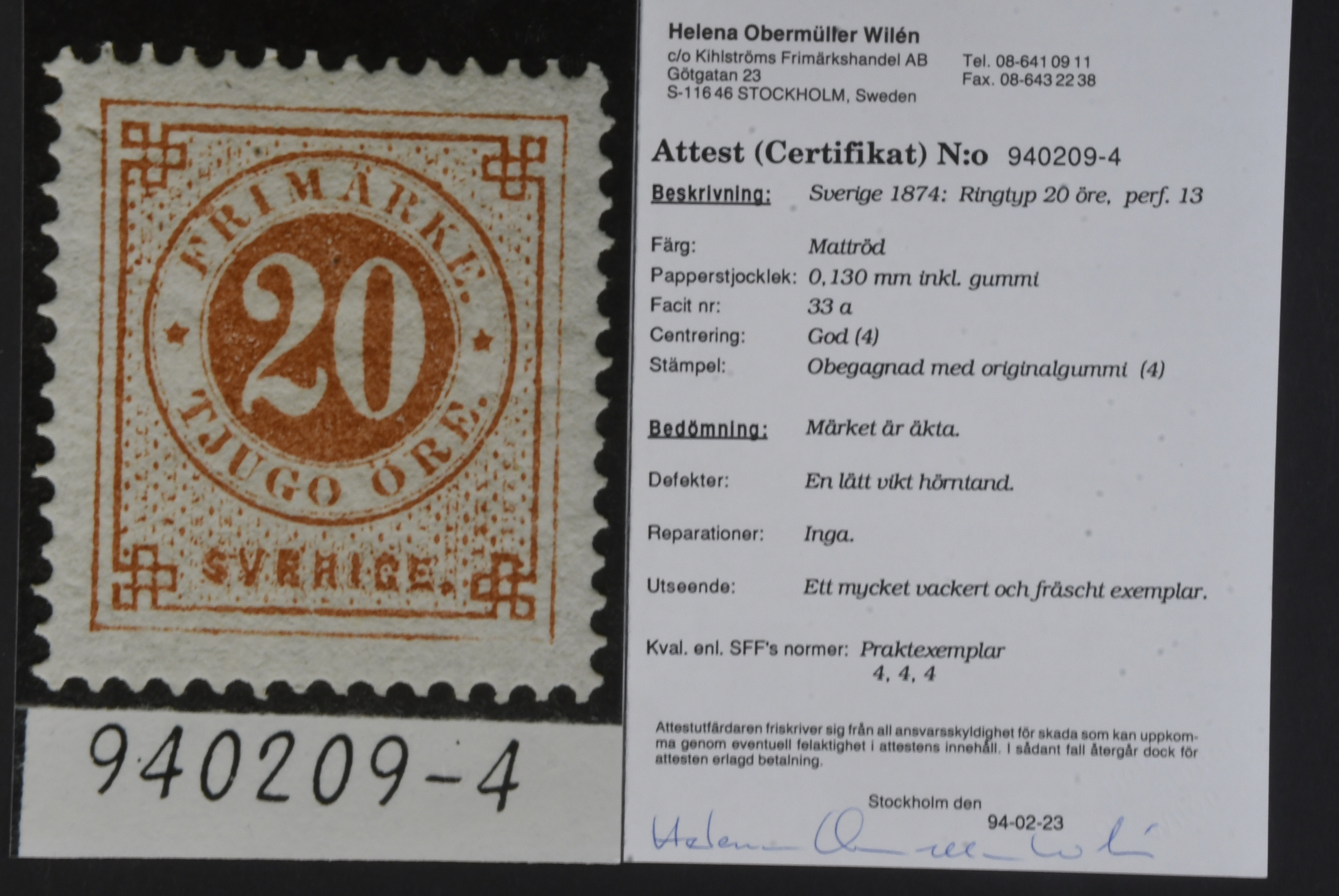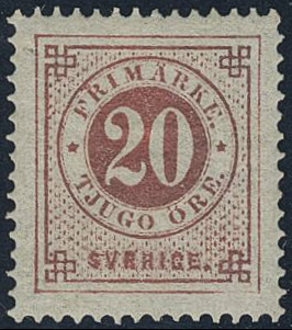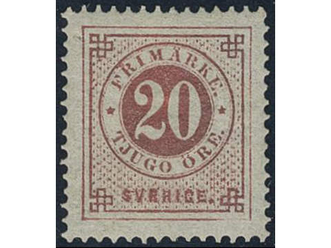 Sweden. Facit 33a ★, 20 öre carminish red - dull red. Superb. Certificate HOW 4, 4, 4 (1994).