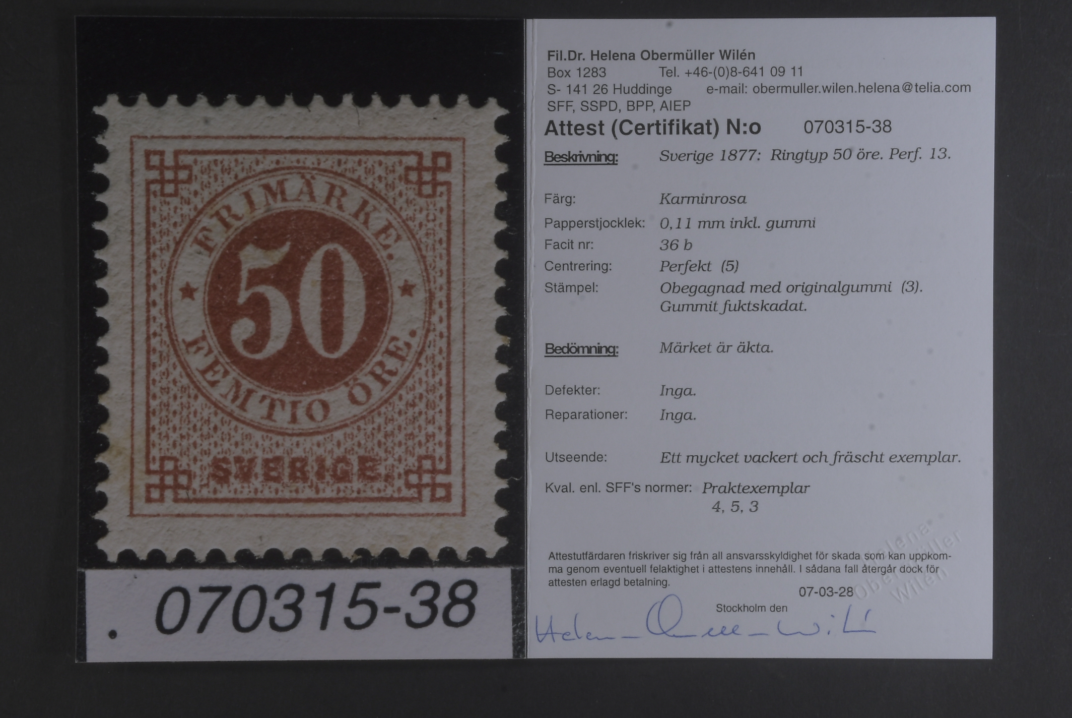 Sweden. Facit 36b ★, 50 öre carmine-rose. Superb example with EXCELLENT centering. The gum somewhat moisture affected. Very scarce shade in this quality. Certificate HOW 4, 5, 3 (2007).