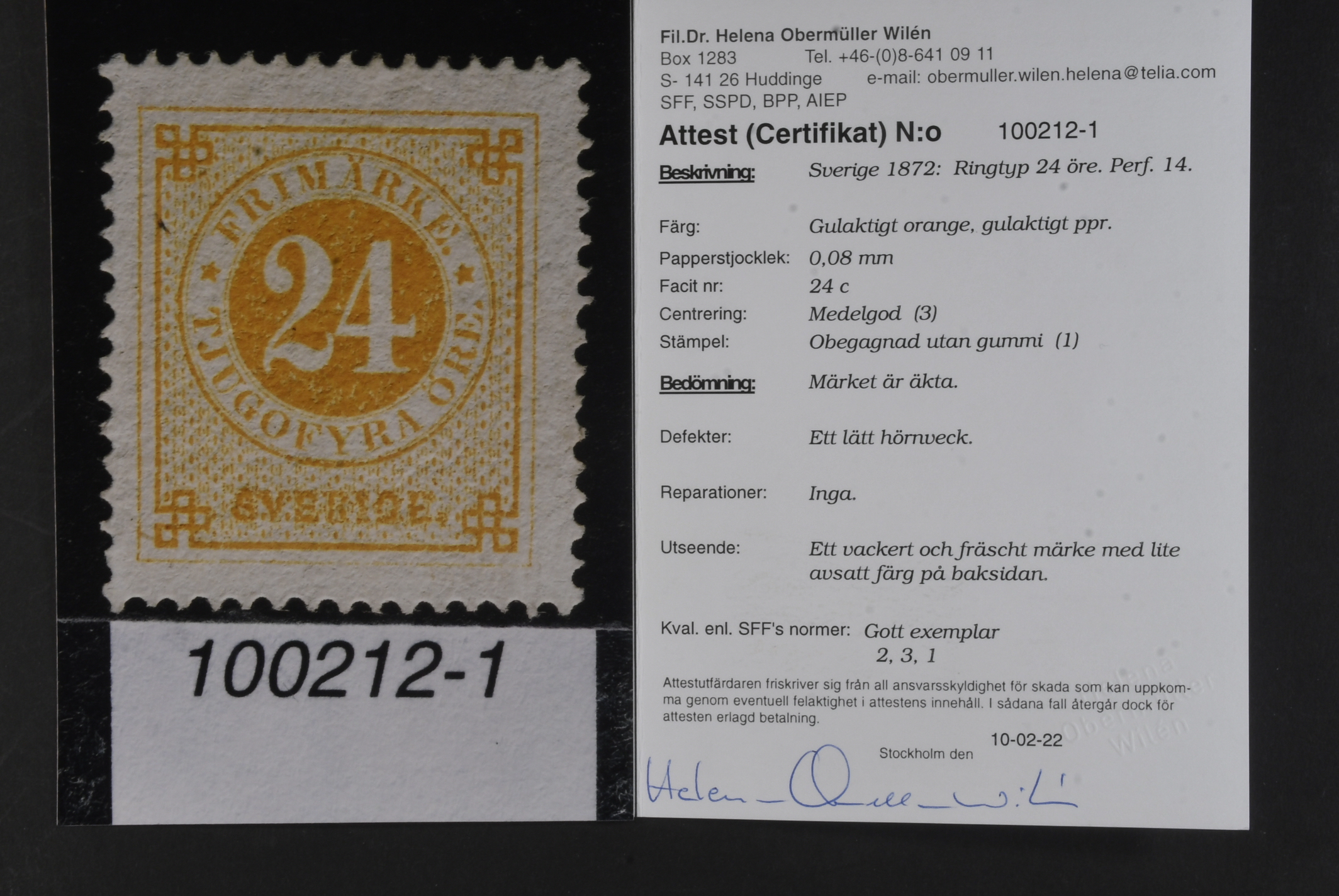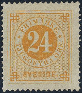 Sweden. Facit 24c v (★), 24 öre yellow-orange on yellowish paper. Abklatsch ('set-off') of about 50 % of the frame. Certificate 2, 3, 1 (2010). SEK 10000