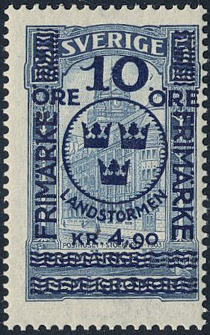 Sweden. Facit 125 ★★, 1916 Landstorm II 10+4,90 / 5 kr blue. Very fresh. SEK 1800