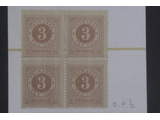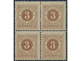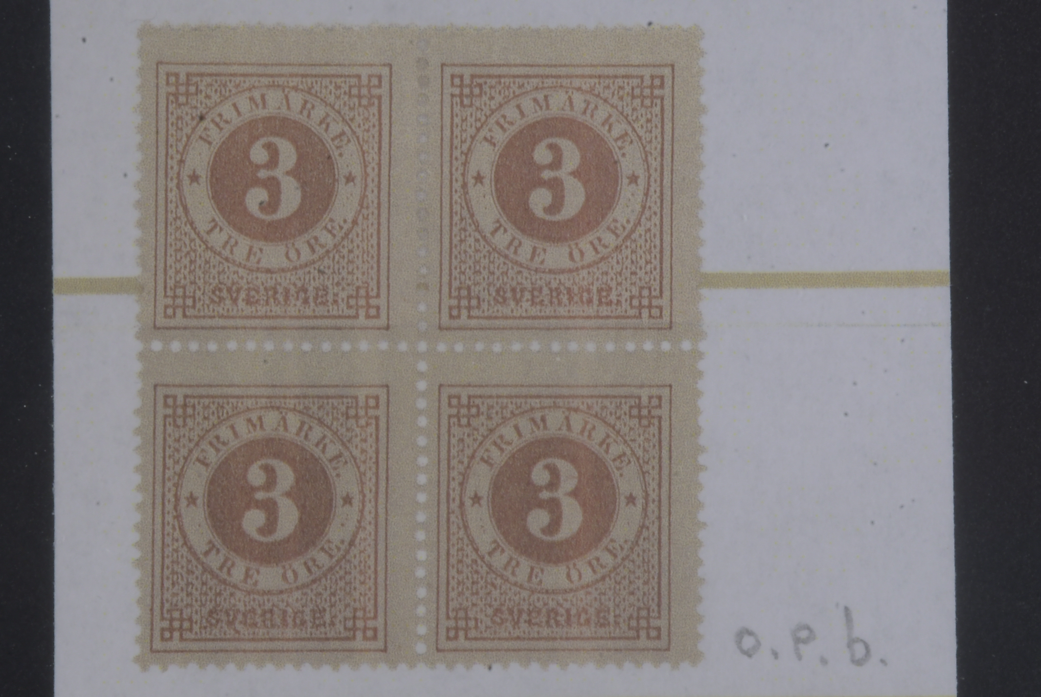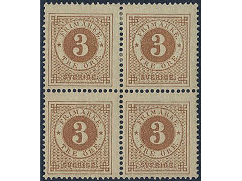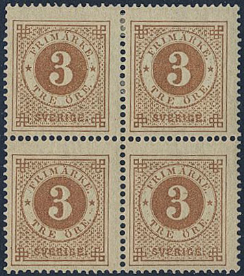 Sweden. Facit 17b ★★/★, 3 öre yellow-brown on smooth paper in block of four. Two stamps …