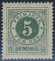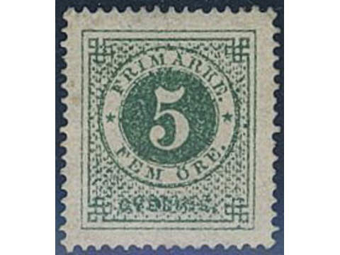 Sweden. Facit 19f ★, 5 öre dark green, grainy print. Weakly bent corner perf. Gum slightly moisture affected. EXCELLENT centering. SEK 3200