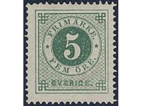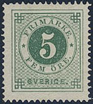 Sweden. Facit 19g ★, 5 öre dark green, smooth print. One slightly short perf. Superb centering. SEK 4000