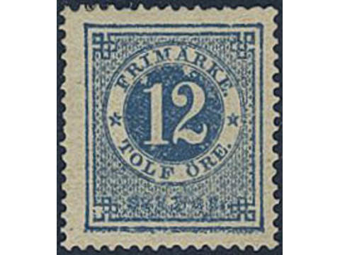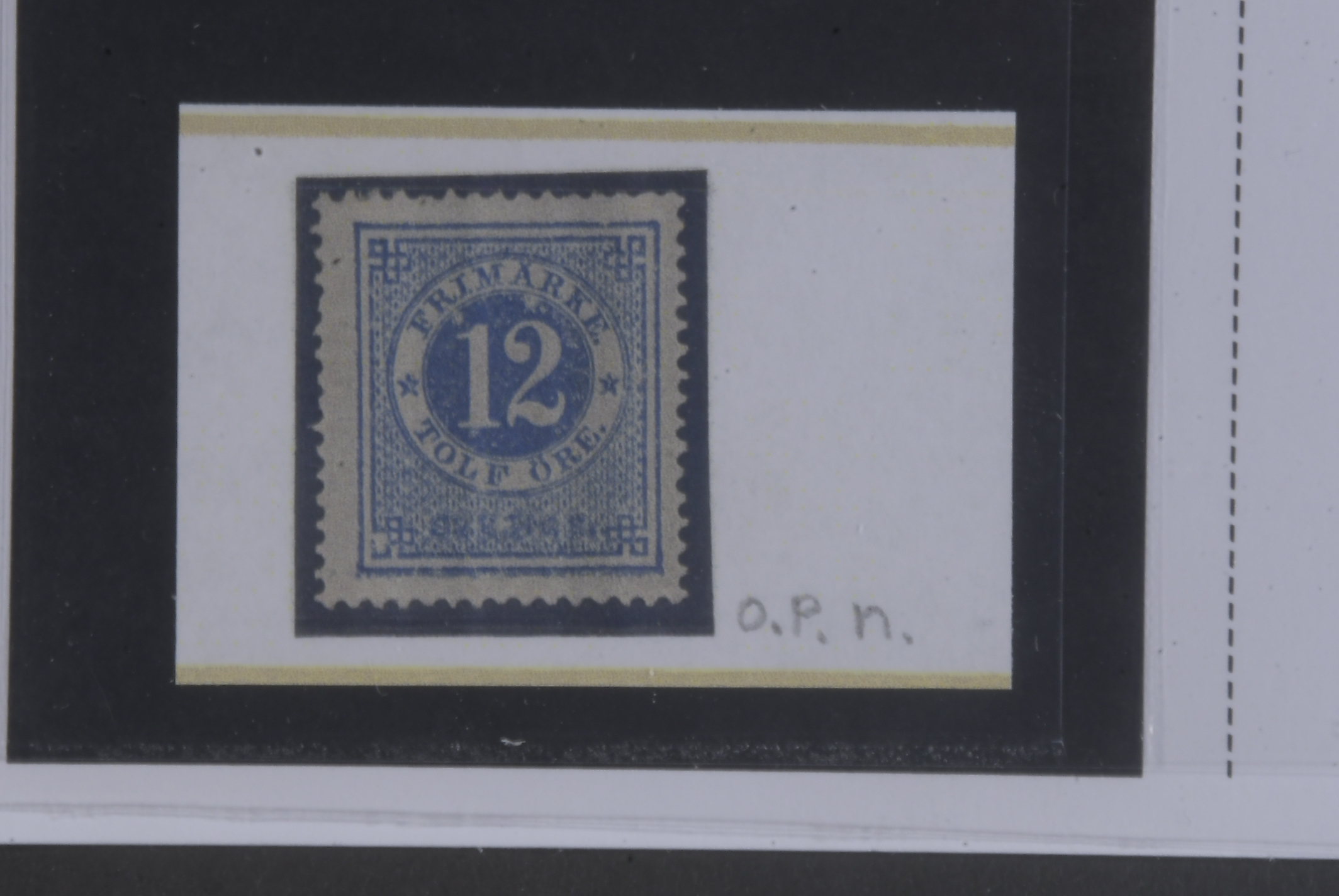 Sweden. Facit 21n ★, 12 öre dark blue, dense blurred background. Slightly short perfs. Superb centering. Opinion (shade) by O.P. SEK 2200