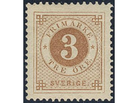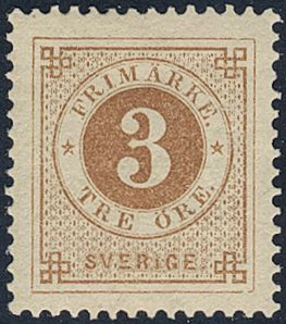 Sweden. Facit 28h ★, 3 öre yellowish orange-brown, calendered or soft paper. SEK 1200