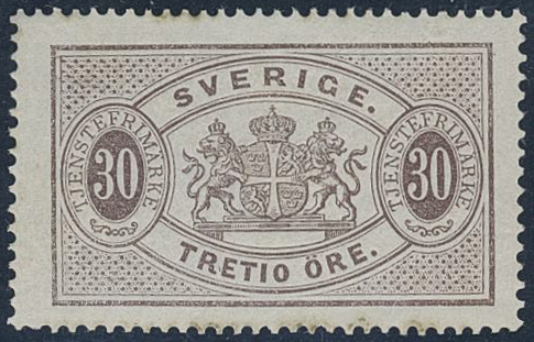Sweden. Official Facit Tj8a ★, 30 öre deep brown, perf 14, blue-greyish paper. Opinion …