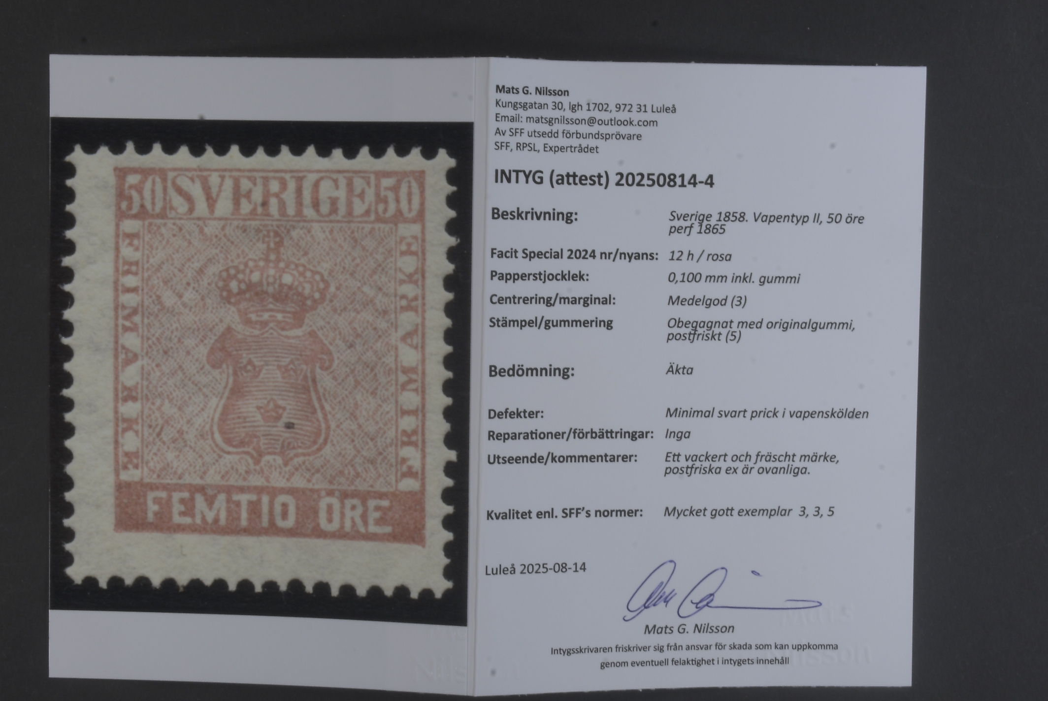 Sweden. Facit 12h ★★, 50 öre rose. Beautiful and fresh MNH example. Certificate Mats Nilsson 3,3,5 (2025). SEK 14000