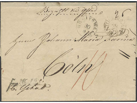 Sweden. Foreign-related cover. Germany. Partly prepaid cover sent from STOCKHOLM 26.9.1834 via GREIFSWALD 30.9 to Cologne.