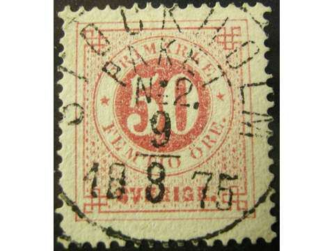 Sweden. Facit 26 used , 50 öre red. EXCELLENT cancellation STOCKHOLM PAKET No 2 9.8.1875. Two short perfs.