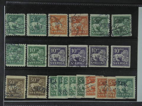Sweden. Used 1920–34. Standing Lion. All different, e.g. F 140C+Ccx, 141bz, 142Ecxz, 143Acc+Ecxz, 144Ccx+Ecx, 145E+Ecx+Ecxz, 146E, and 148Acx+Acxz. Mostly good quality. F 5985 (21)