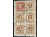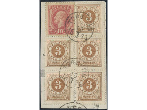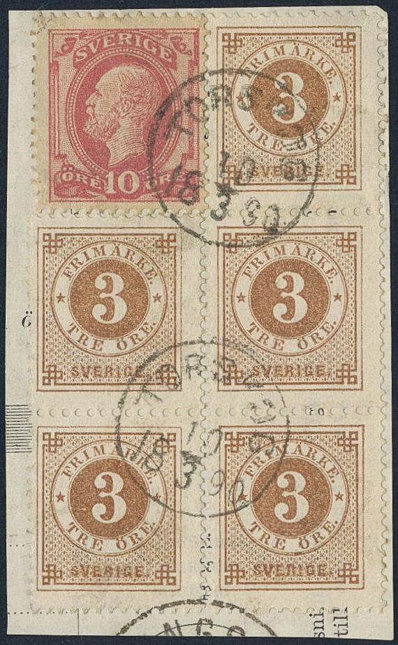 Sweden. Facit 41, 45 on piece, 3 öre in block of five + 10 öre Oscar on cut piece, cancelled TORSKOG 10.3.1890.