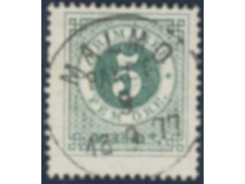 Sweden. Facit 19h used , 5 öre dull bluish green, unclean colour. Beautiful cancellation MALMÖ PAKET 9.9.1877. Signed Olle Pettersson.