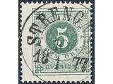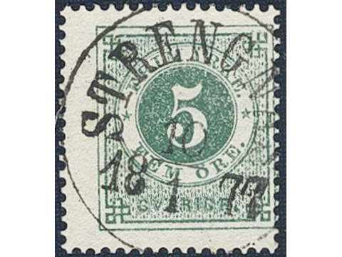 Sweden. Facit 19h used , 5 öre dull bluish green, unclean colour. Superb cancellation STRENGNÄS 10.1.1877. Signed Olle Pettersson.