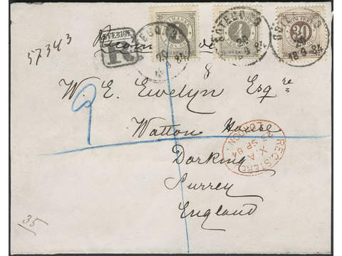 Sweden. Facit 29e, 35i cover , 2×4+30 öre på vackert rekbrev sänt från GÖTEBORG 20.9.1884 till England. Ankomststämplat LONDON REGISTERED 23.SP.84 och DARKING 23.SP.84.