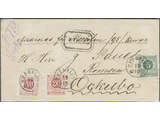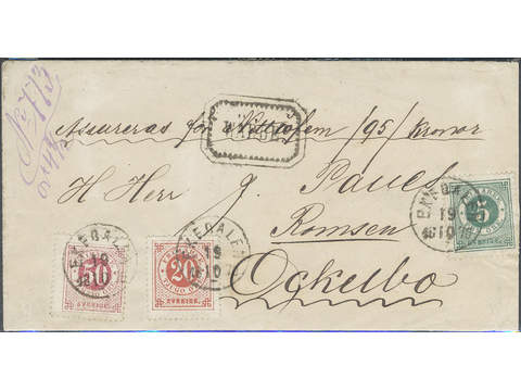 Sweden. Facit 30c, 33a, 36a cover , 5 öre green, rich smooth print, 20 öre carminish red-dull red and 50 öre carmine on inland cover of lowest rate insured for 95 kr (1 öre overpaid). Cancelled EKEDALEN 19.10.1878, boxed WÄRDE cancellation. Part of back missing.