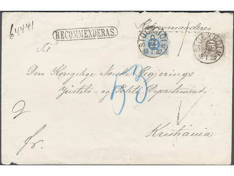 Sweden. Facit 35g, 32e cover , 30 öre brown blurred print and 12 öre dull blue (greyish blue) (short perf.) on registered cover of second rate sent to Norway, cancelled STOCKHOLM 26.1.1882. Attractive cover.