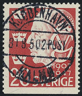 Sweden. Facit 377B. Cancellations, DENMARK. Danish cancellation KJØBENHAVN-MALMØ 2.POST 31.8.50. EXCELLENT.