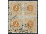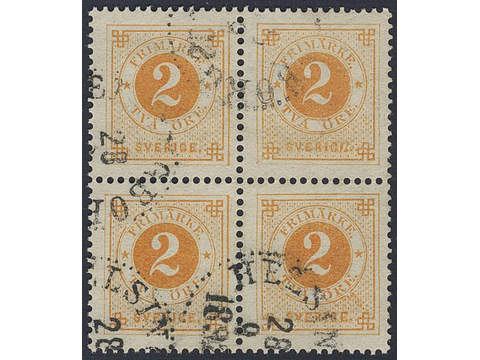 Sweden. Facit 40 used , 2 öre in block of four cancelled HELSINGBORG 28.9.1892. SEK 1400