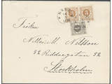 Sweden. Facit 41a (x2), 42d cover , 3 öre yellowish brown in two copies and 4 öre grey-black on yellowish paper on inland cover of lowest rate cancelled KALL 14.3.1892. Ex. Göta Frimärken auction 2.9.2019 (600 SEK).