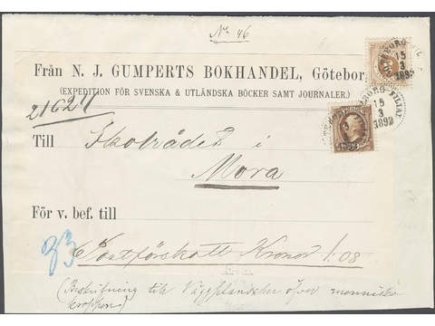 Sweden. Facit 41b, 58a cover , 3 öre orange-brown and Oscar 30 öre yellowish reddish brown on front of second rate printed matter with COD of 1.08 kr.