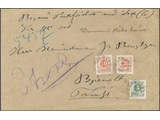 Sweden. Facit 43a, 46b (x2) cover , 5 öre dull blue-green and two copies of 20 öre light orange-red on cover of second rate with COD of 6 kr 45 öre. Cancelled HALMSTAD 6.11.1887, slightly cut down.