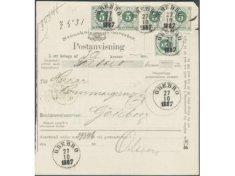Sweden. Facit 43a cover , 5 öre dull blue-green in five copies (one with short perfs) on attractive postal money order, cancelled ÖREBRO 27.10.1887.