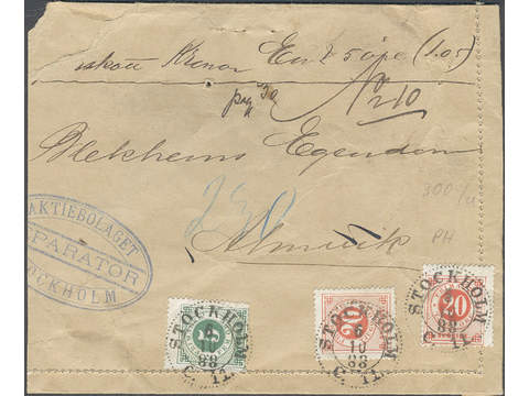 Sweden. Facit 43b, 46c cover , 5 öre dark green, clean distinct print and two copies of 20 öre dark orange-red-orange-red on inland cover with COD of 1.05 kr. Cancelled STOCKHOLM 6.10.88 (inverted date in cds).