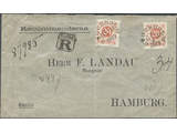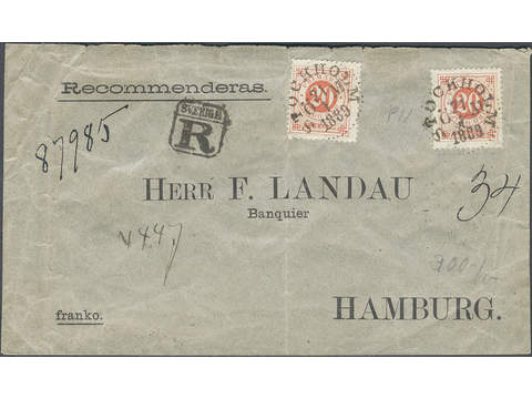 Sweden. Facit 46b cover , 20 öre light orange-red on two copies (one short perf.) on registered cover of lowest rate to Germany, cancelled STOCKHOLM Ö M 21.1.1889.