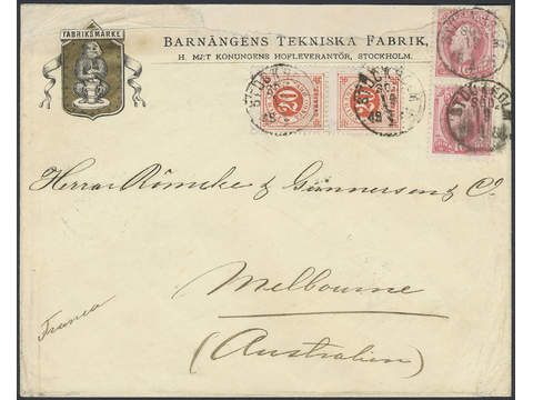 Sweden. Facit 46c, 45b cover , 2x10+2x20 öre (pairs) on cover sent from STOCKHOLM SÖD. 19.1.1888 to Victoria. Transit BRINDISI 24.1.88 and arrival pmk MELBOURNE 29.FE.88. The cover is missing the back flap and with repaired paper loss at top. A few worn perfs, nevertheless a decorative advertisement cover. UNIQUE combination to Victoria according to Ferdén.