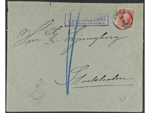 Sweden. Facit 54e cover , 1895 Oscar II 10 öre bright carmine on inland cover of lowest rate cancelled UMEÅ 14.2.1902. Undelivered to recipient and violet boxed ink cancellation "OBESTÄLLBART genom brevbäraravd. Stockholm 1". Crayon note on reverse "adres…