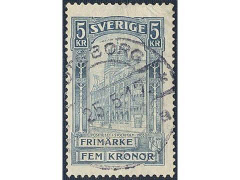 Sweden. Facit 65vm1 used , 1903 General Post Office 5 Kr blue, inverted wmk. Lightly cancelled GÖTEBORG 25.5.17. Minor wrinkle in upper right corner. Scarce watermark variety. SEK 2000