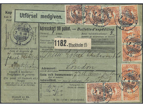 Sweden. Facit 86 cover , 10×25 öre (ngt oxiderade) på adresskort till paket sänt från STOCKHOLM 7.9.18 till England. Ett mycket sällsynt adressland för paket, där endast ett par sända tidigare finns registrerade.