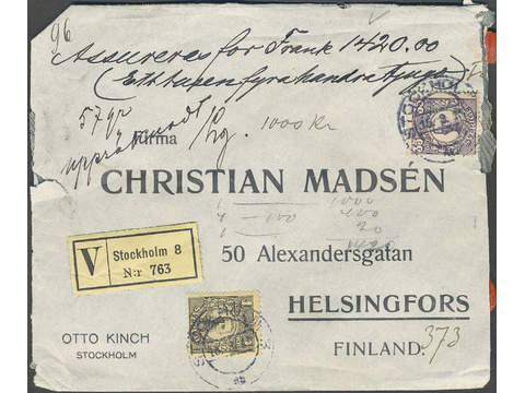 Sweden. Facit 89, 96 cover , 35 öre violet and 1 krona black on insured (insured for 1420 franc) cover of second rate with listed contents, sent to Finland. Cancelled STOCKHOLM 8 15.3.15. Listed contents are rare, especially to abroad. This is the only recorded example of listed contents to Finland, and it is overall exceedinly rare to any destination. Censor strip on reverse.