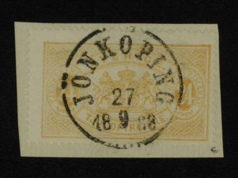 Sweden. Official Facit Tj20 on piece, 24 öre gul, tandn. 13. Litet brevstycke med praktexemplar stämplat JÖNKÖPING 27.9.1888.
