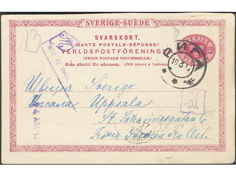 Sweden. Postal stationery, Double postcard, Facit bKd13, Response card 10 öre sent from RIGA 19.3.17, Russia, to Uppsala. Small, weak crease.