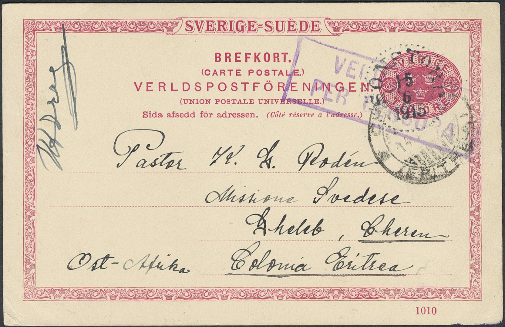 Sweden. Postal stationery, Single postcard, Facit bKe14/1010, Postcard 10 öre sent from SONSTORP 15.6.1915 to Eritrea. Censor mark and arrival cancellation.