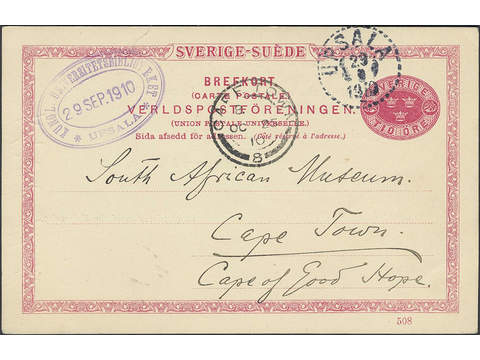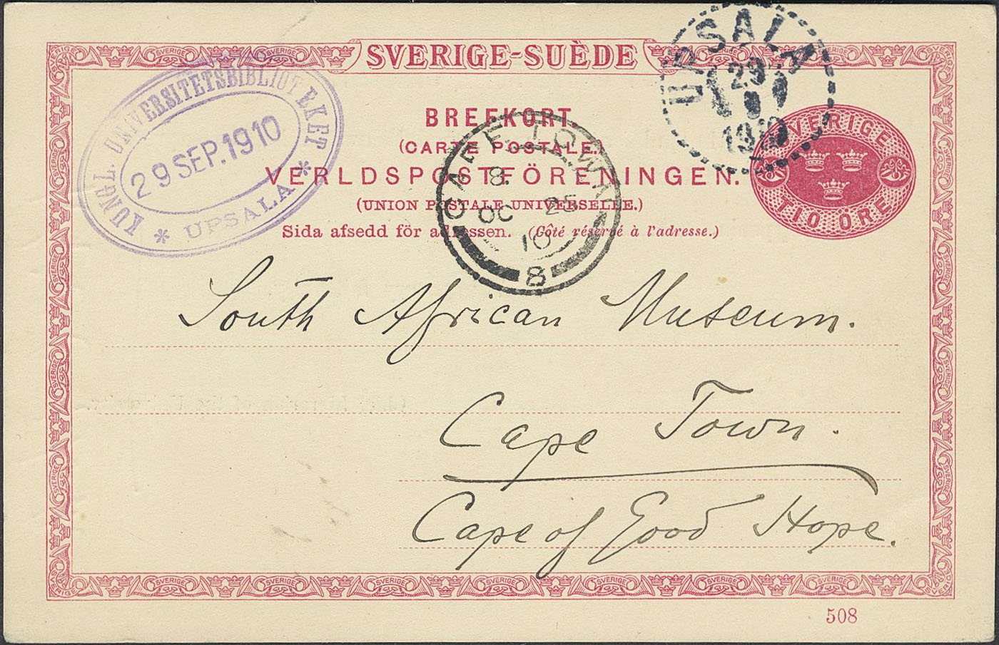 Sweden. Postal stationery, Single postcard, Facit bKe14/508, Postcard 10 öre sent from Kungl. Universitetsbiblioteket UPSALA to South African Museum in CAPE TOWN 25.OC.10.