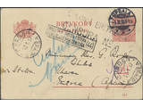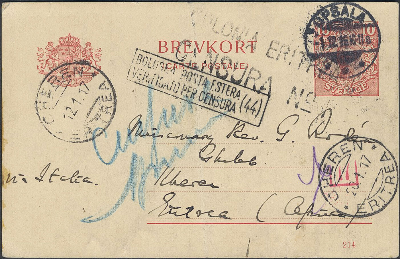 Sweden. Postal stationery, Single postcard, Facit bKe19/214, Postcard 10 öre sent from UPSALA 1.12.16 to missioner in Eritrea. Several censor marks plus arrival pmk CHEREN 12.1.17. Interesting item.