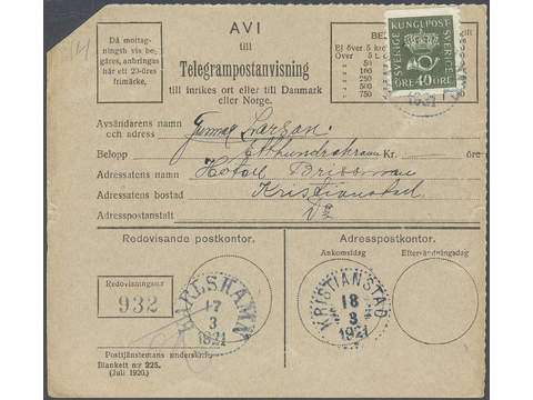 Sweden. Facit 158 cover , 40 öre olive-green vertical perf 9¾ type I as single franking on telegram postal money order sent domestic. Cancelled KARLSHAMN 17.3.1921.