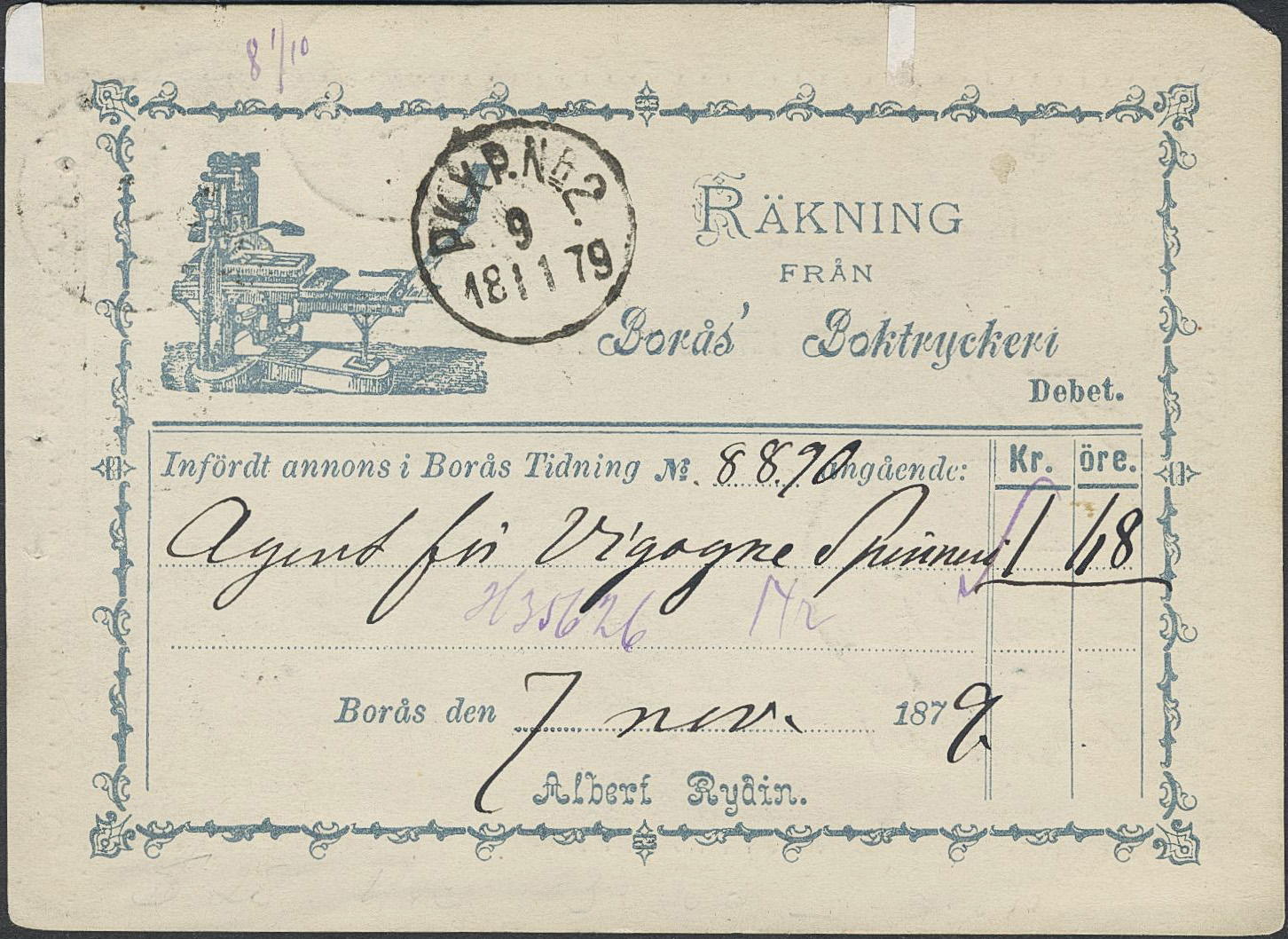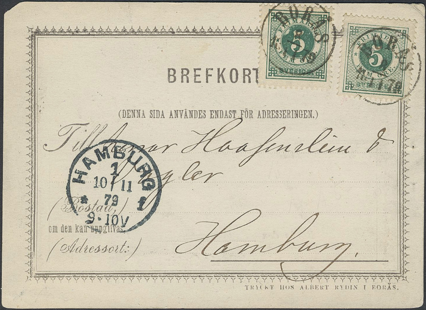 Sweden. Facit 30 on cover, 2×5 öre on early postcard (one round corner) sent from BORÅS 8.11.1879 via PKXP Nr 2 9.11.1879 to HAMBURG 10.11.79. Privately manufactured postcards were not allowed abroad until 1.4.1886. Scarce item.