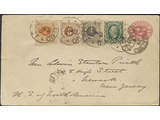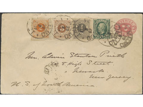 Sweden. Facit 40–42, 52, Fk3 on cover, 2+3+4+5 öre on stamped envelope 10 öre, sent from MALMÖ 1.POST 29.9.1891 to USA. Arrival pmk NEWARK 12.OCT.91.