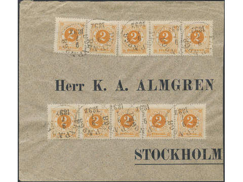 Sweden. Facit 40 on cover, 10×2 öre on cover (somewhat reduced in size at right), sent from PKXP No 68 9.7.1892 to Stockholm.