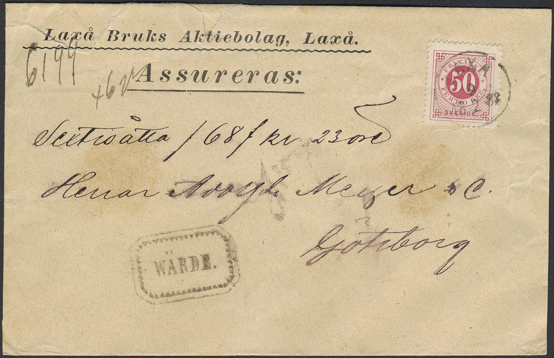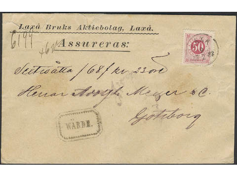 Sweden. Facit 48c on cover, 50 öre violet-carmine as single franking on inland cover of second rate insured for 68 kr, cancelled LAXÅ 9.2.1888. Boxed WÄRDE cancellation.