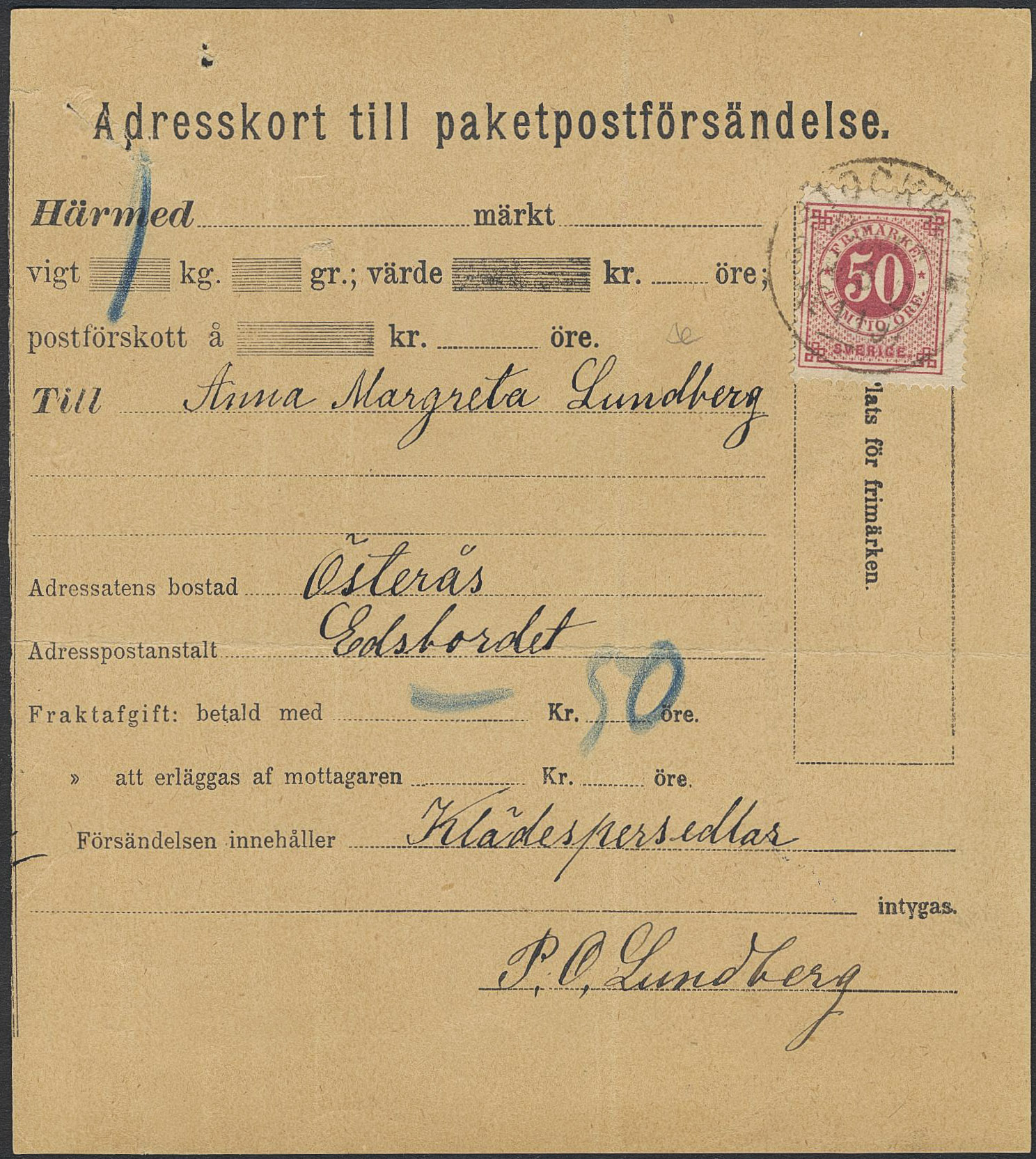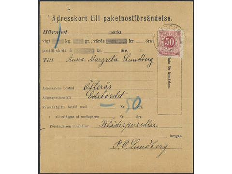 Sweden. Facit 48d on cover, 50 öre dull carmine on yellowish paper as single franking on parcel card cancelled STOCKHOLM PAKET 5.11.1891.